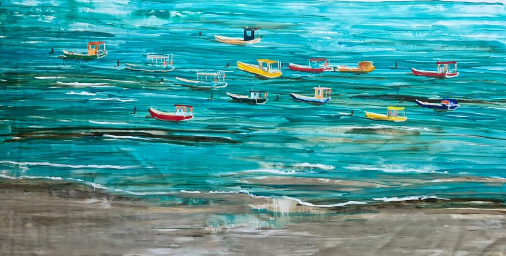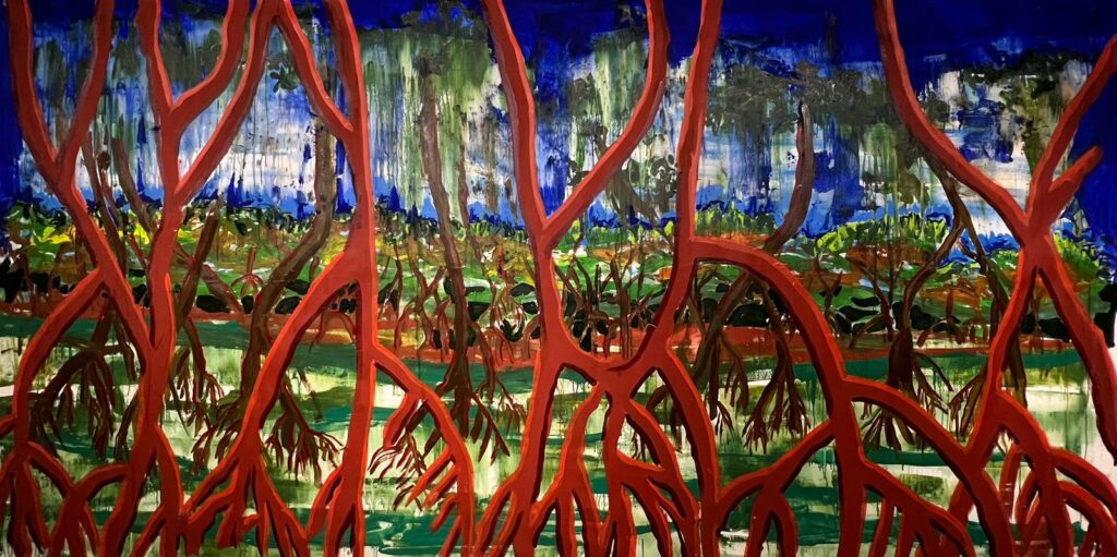 Nas obras de “Entre o mar e o sertão, tem o mangue”, o gesto artístico de Simone Freitas constrói imagens subjetivas e sensoriais que traduzem a complexidade dos ecossistemas alagoanos. Sobreposições e cores vibrantes revelam paisagens internas e externas, filtradas pelas lentes da memória e da vivência. “Essas memórias afetivas me inspiraram a criar uma série que transita entre os lugares do meu cotidiano e lembranças que nos conectam a espaços ou momentos vividos”, afirma.