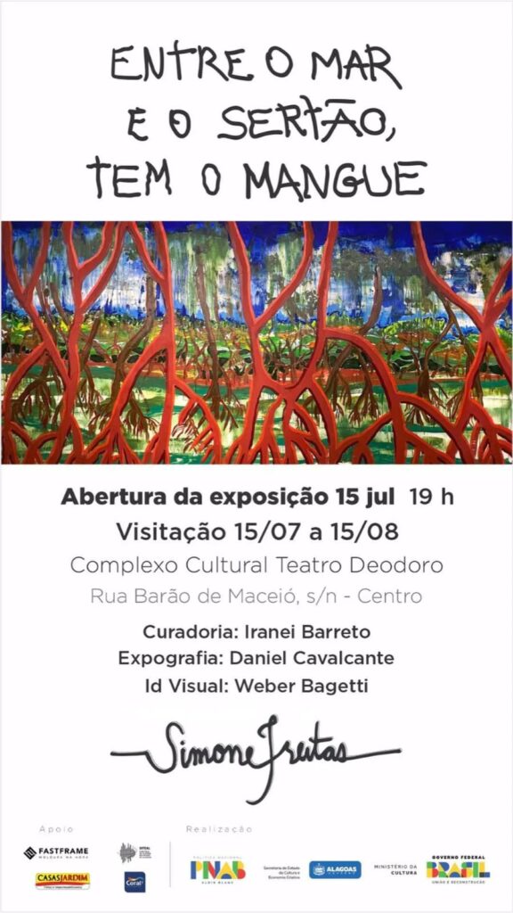 Essa é a terceira individual de Simone Freitas. Sua estreia aconteceu em 2018, com “Através do a(mar)”, no Museu da Imagem e do Som de Alagoas(MISA). Desde então, participou de diversas coletivas, como o “Circuito Criativo das Alagoas”, no Museu Histórico de Jundiaí, em São Paulo; “Urbanografia”(2019), na Galeria Gama, em Maceió; e o “Circuito Expositivo da Casa Tato”(2024), em São Paulo, que reuniu curadores de destaque como Claudinei Roberto. Também integrou feiras e exposições internacionais, entre elas “Le Carrousel du Louvre”(2022), em Paris; “Brussels International – Contemporary Art Salon”(2022), na Bélgica; e a mostra “Brasil X Portugal – Rota das Empreendedoras” (2024), na cidade do Porto. No Brasil, esteve presente em eventos como a “Casacor Recife”. Sua experiência mais recente foi uma imersão no Sertão do Uma, sob mentoria da curadora Julie Belfer.
