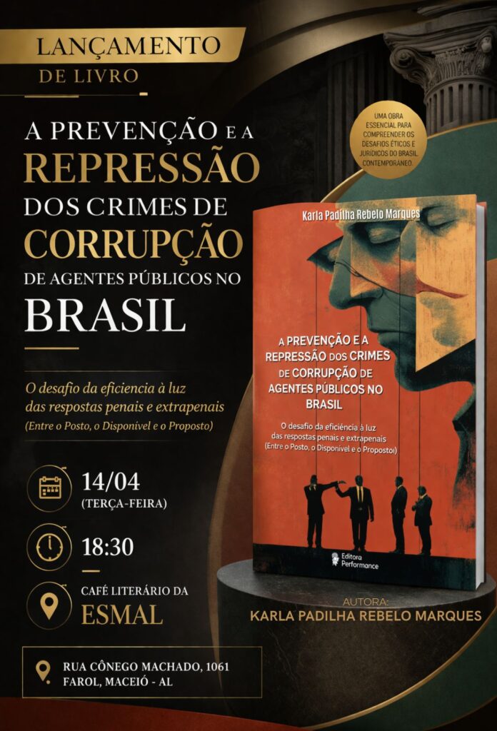 A jurista Karla Padilha Rebelo Marques lança nesta terça-feira, 14 de abril, às 18h30, a obra “A Prevenção e a Repressão dos Crimes de Corrupção de Agentes Públicos no Brasil: o desafio da eficiência à luz das respostas penais e extrapenais (Entre o posto, o disponível e o proposto)”. O evento acontece no Café Literário da ESMAL, em Maceió (AL).